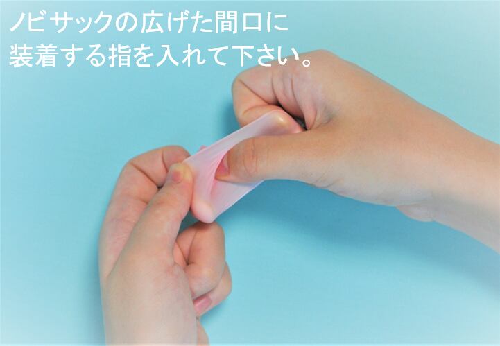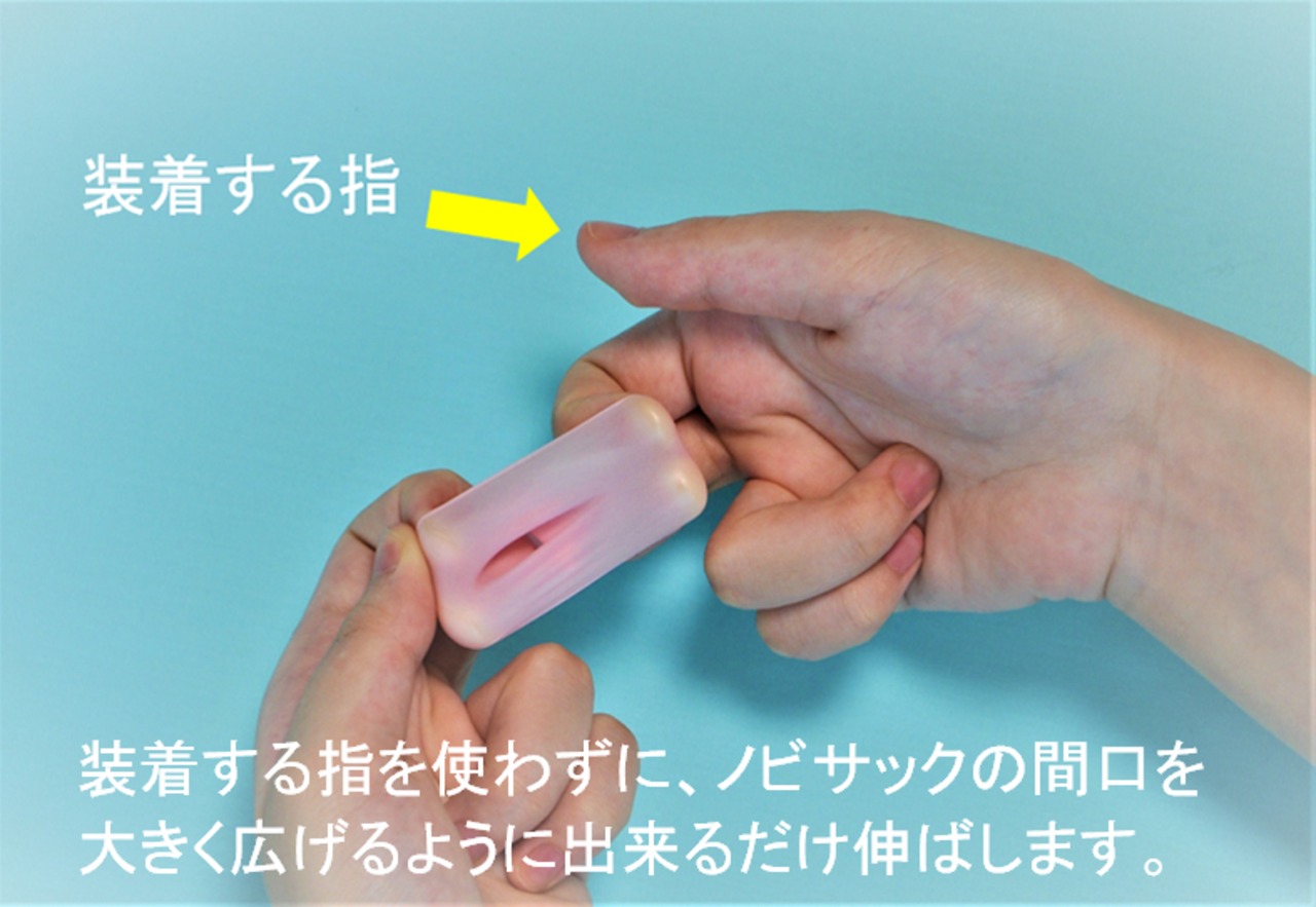 1.ノビサックを装着する指以外の指を使って(装着する指を使わずに)、ノビサックの間口を大きく広げるように出来るだけ伸ばします。